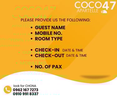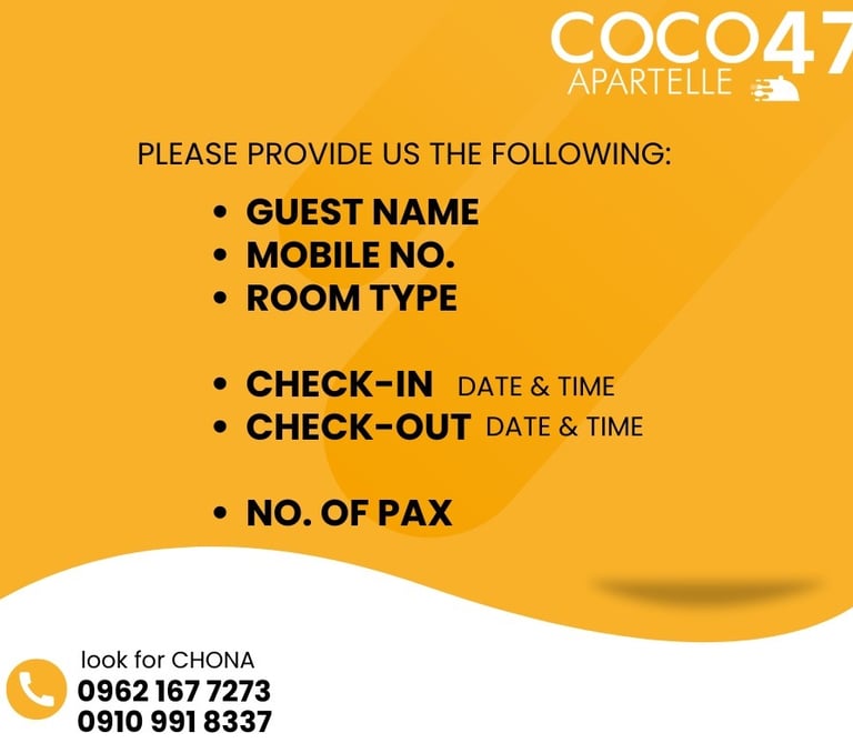 To secure your stay through our Online Booking system, please provide your confirmed dates along with your preferred check-in and check-out times. We require a 1,000 pesos reservation fee to hold your room, which will be fully deducted from your final balance upon arrival. Once your online payment is complete, please send a copy of the transaction receipt via our Facebook channel using the link provided below. Thank you for choosing us, and we look forward to hosting you!
